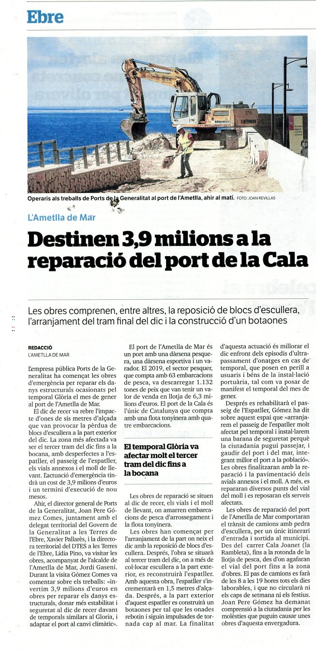 Resum: Les obres comprenen, entre altres, la reposició de blocs d'escullera, l'arranjament del tram final del dic i la construcció d'un botaones. |