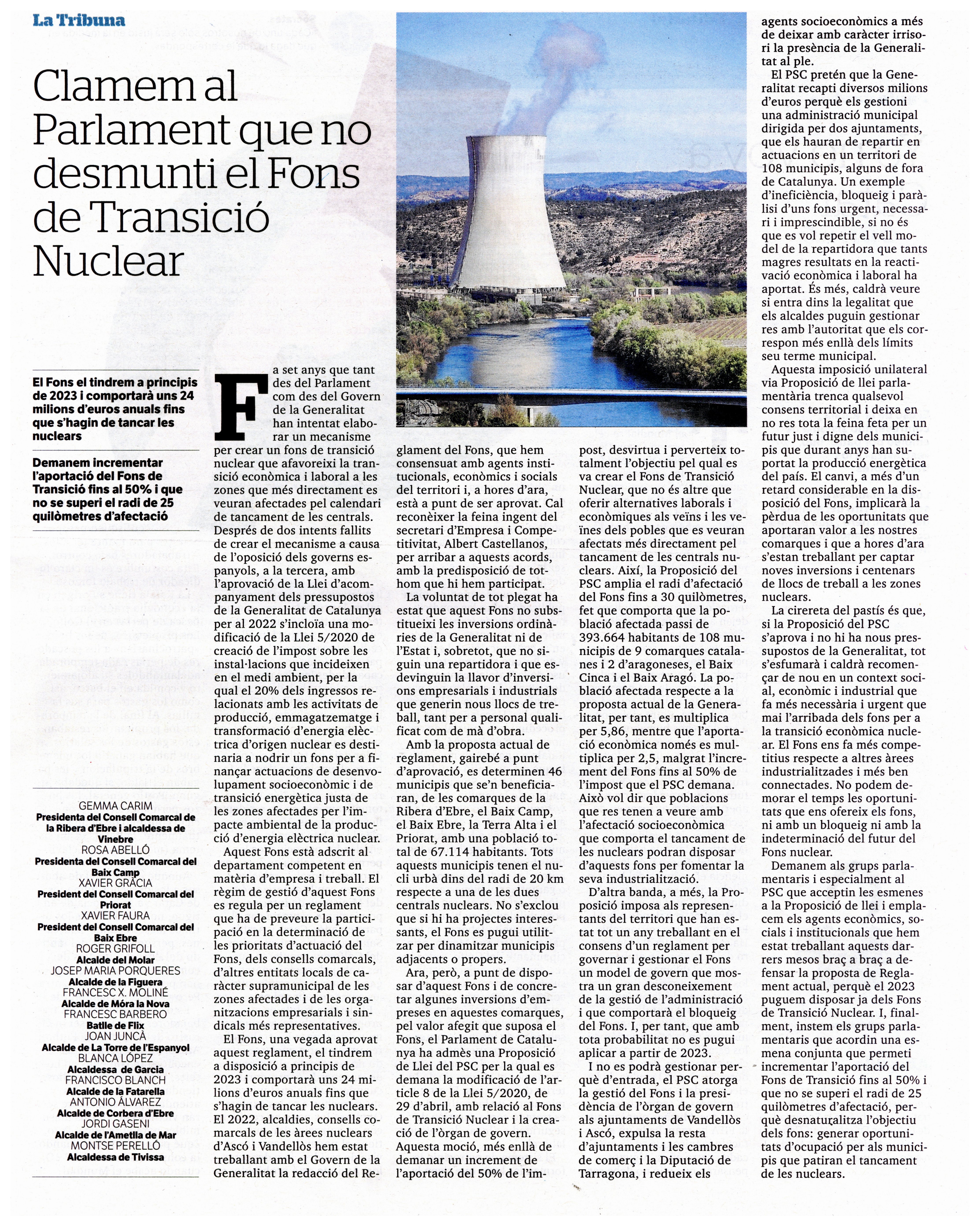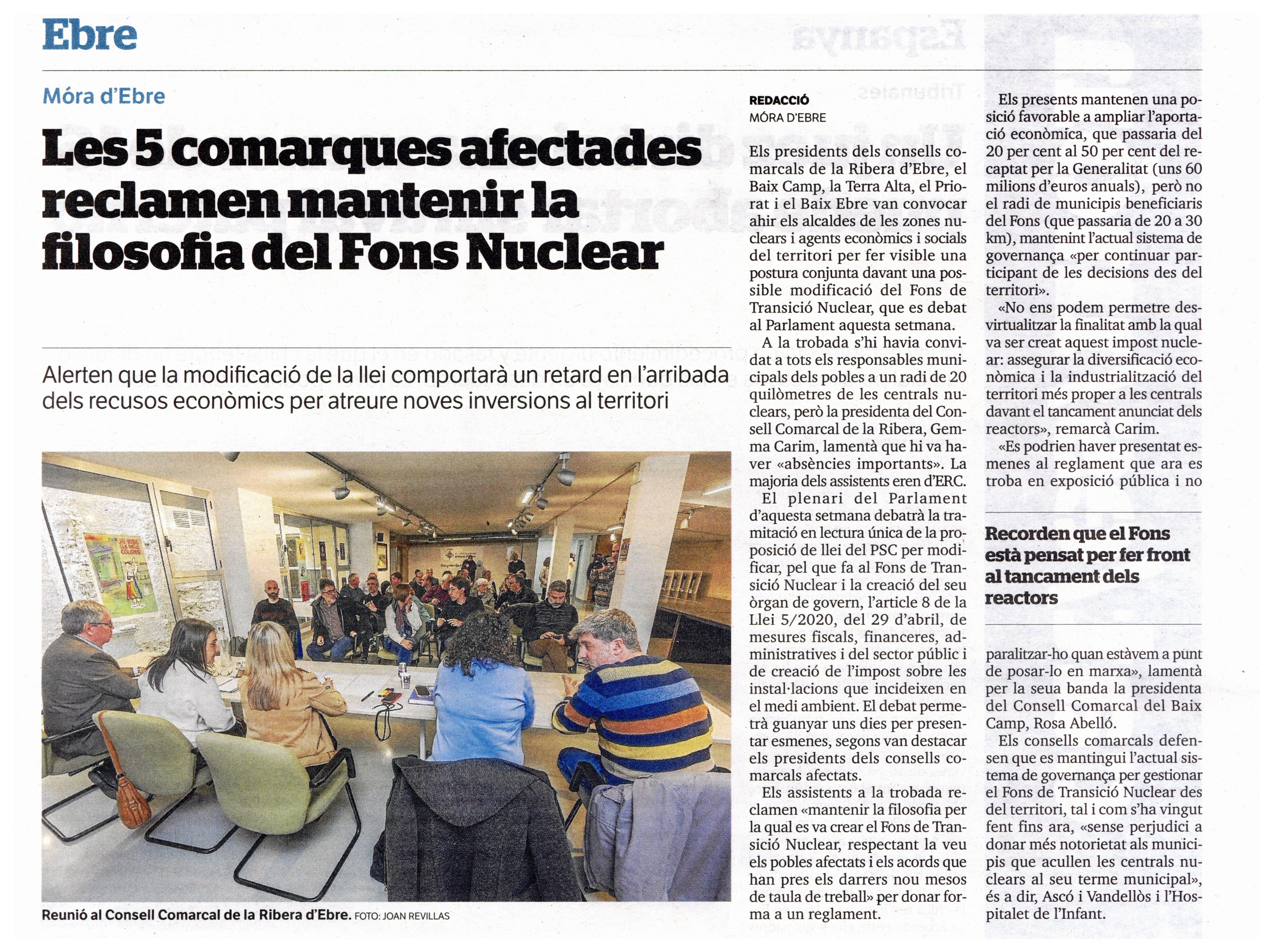 | Les 5 comarques afectades reclamen mantenir la filosofia del Fons Nuclear |